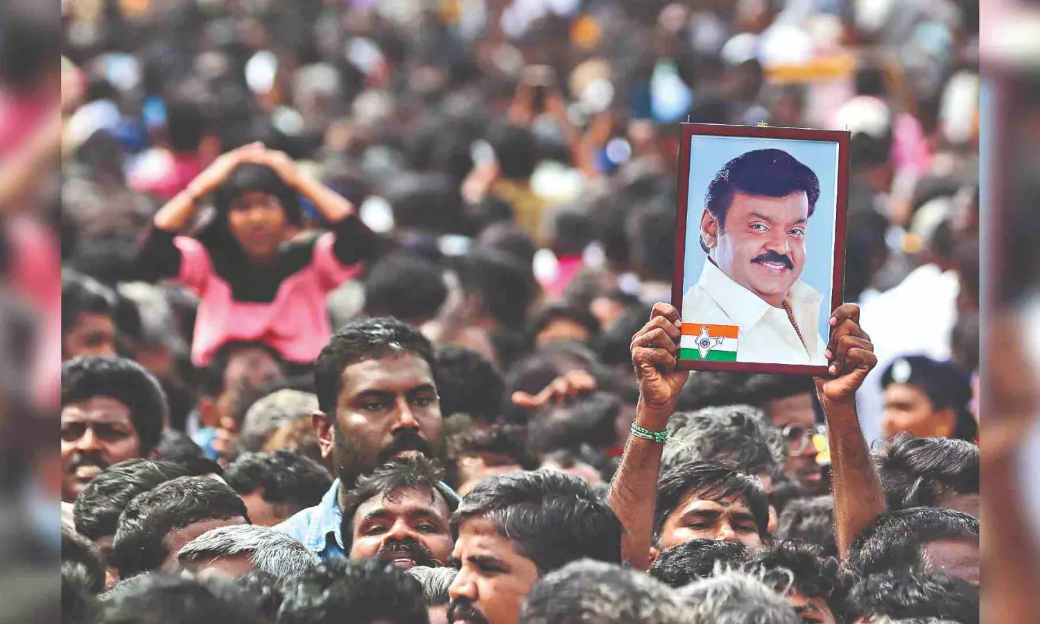 It was close to 3 pm after tens of thousands of people paid their last respects that the body of top yesteryear action star and founder-president of DMDK was taken for the final procession from the Island Grounds with slogans like “long live Captain” splitting the sky. The arterial EVR Road saw something unusual with mourners thronging both sides.