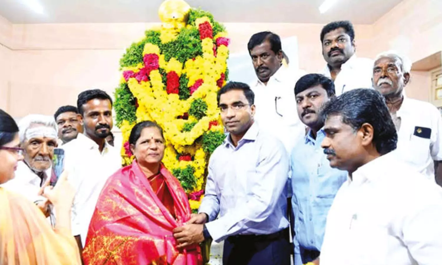Selvi, great granddaughter of VOC, being honoured at Ottapidaram on Tuesday