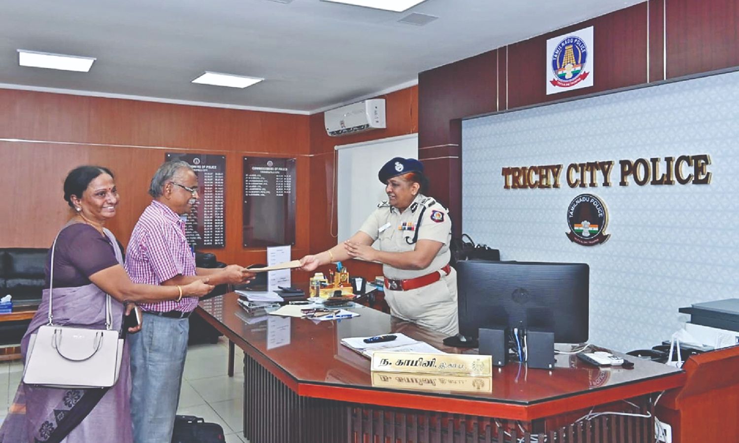 Tiruchy City Commissioner of Police N Kamini handing over the statement of account copy to victim Raja Perumal on Monday