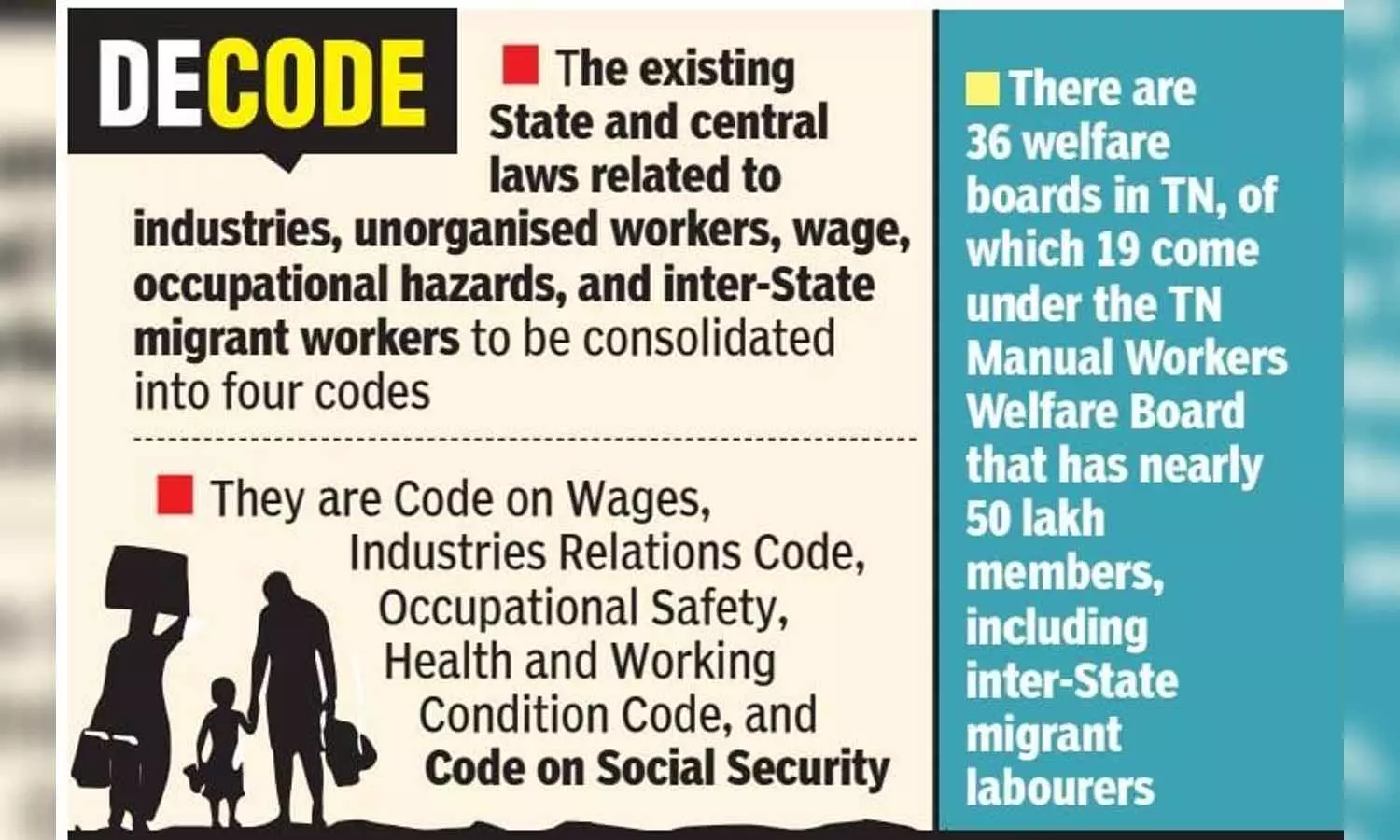 CHENNAI: In a firm step that would help protect the interests of millions of unorganised workers and welfare boards, who are fearing erosion of their rights with the advent of the four Labour Codes, the State government is all set to bring a safety clause in Tamil Nadu Manual Workers (Regulation of Employment and Working Condition) Act, 1982.