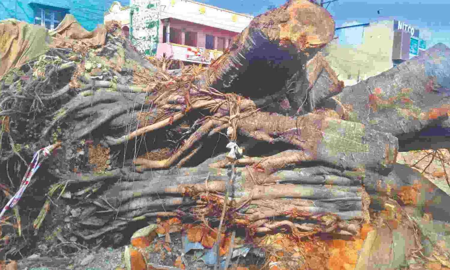 The felled 70-year-old banyan tree in Ranipet district