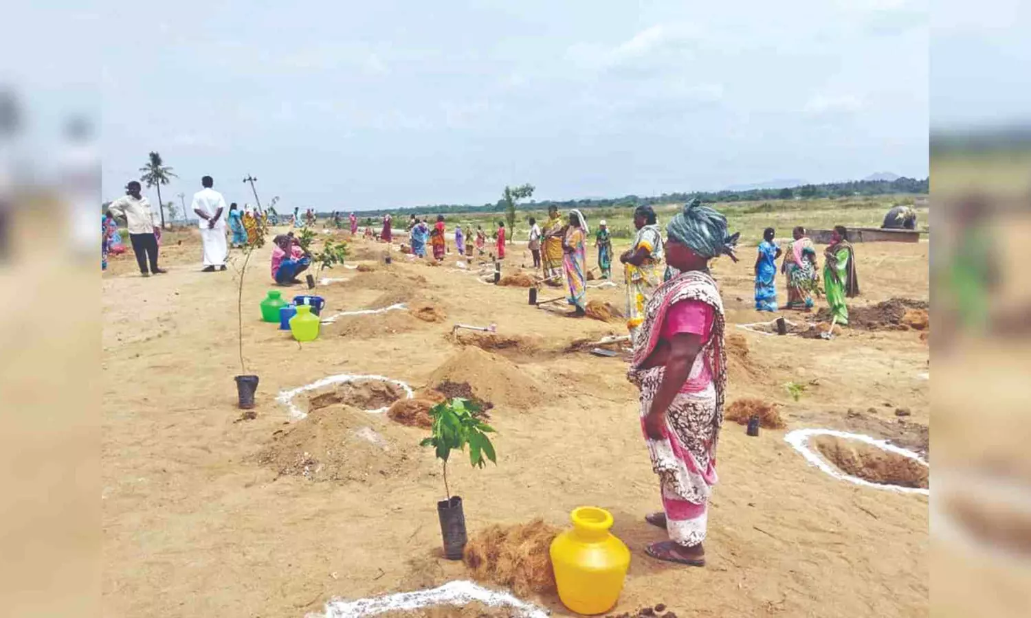 MGNREGS workers plant saplings along Palar river bund in Kizhmonavoor village to prevent havoc by flooding in Vellore