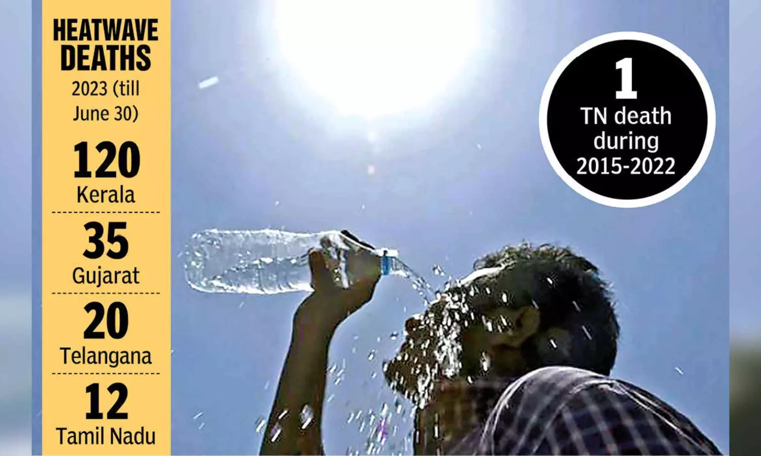CHENNAI: The extreme temperatures witnessed in the State this summer, with mercury crossing 40 degrees Celsius on several days, has also claimed 12 lives as of June 30. This is the highest heatwave-related toll in the past nine years for Tamil Nadu, which reported only one heatwave-related death between 2015 and 2022. As per data released by Satya Pal Singh Baghel, Union Minister of State for Health and Family Welfare, in the ongoing Parliament session, a total of 13 persons died due to heatwaves in Tamil Nadu.