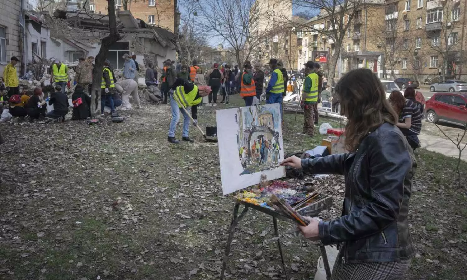 Students and volunteers clear the rubble after the Academy was partly ruined during the Russian missile (AP)