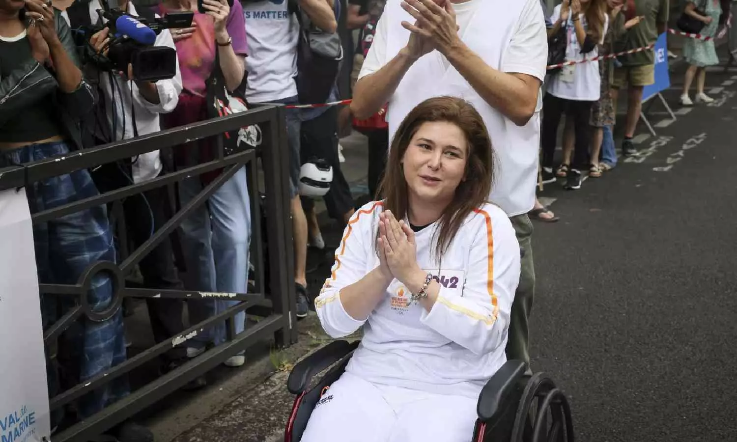 AFP videographer Dylan Collins, also wounded in the Israeli attack, pushed Assi's wheelchair as she carried the torch across the suburb of Vincennes Sunday. Their colleagues from the press agency and hundreds of spectators cheered them on.