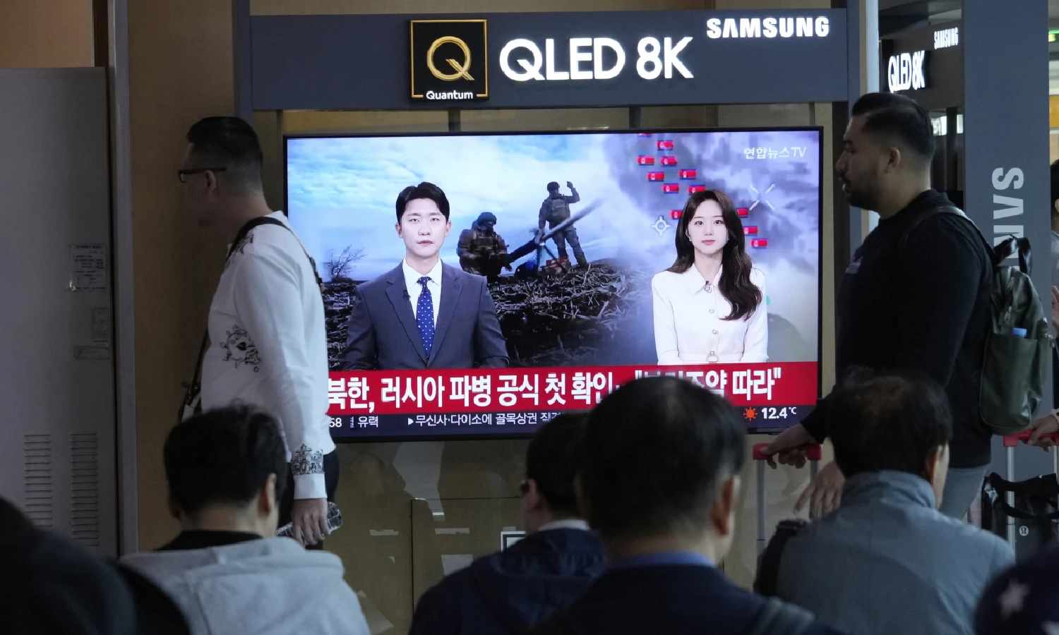 People pass by a TV screen reporting North Korea confirms troops deployment to Russia during a news program at the Seoul Railway Station in Seoul (AP)