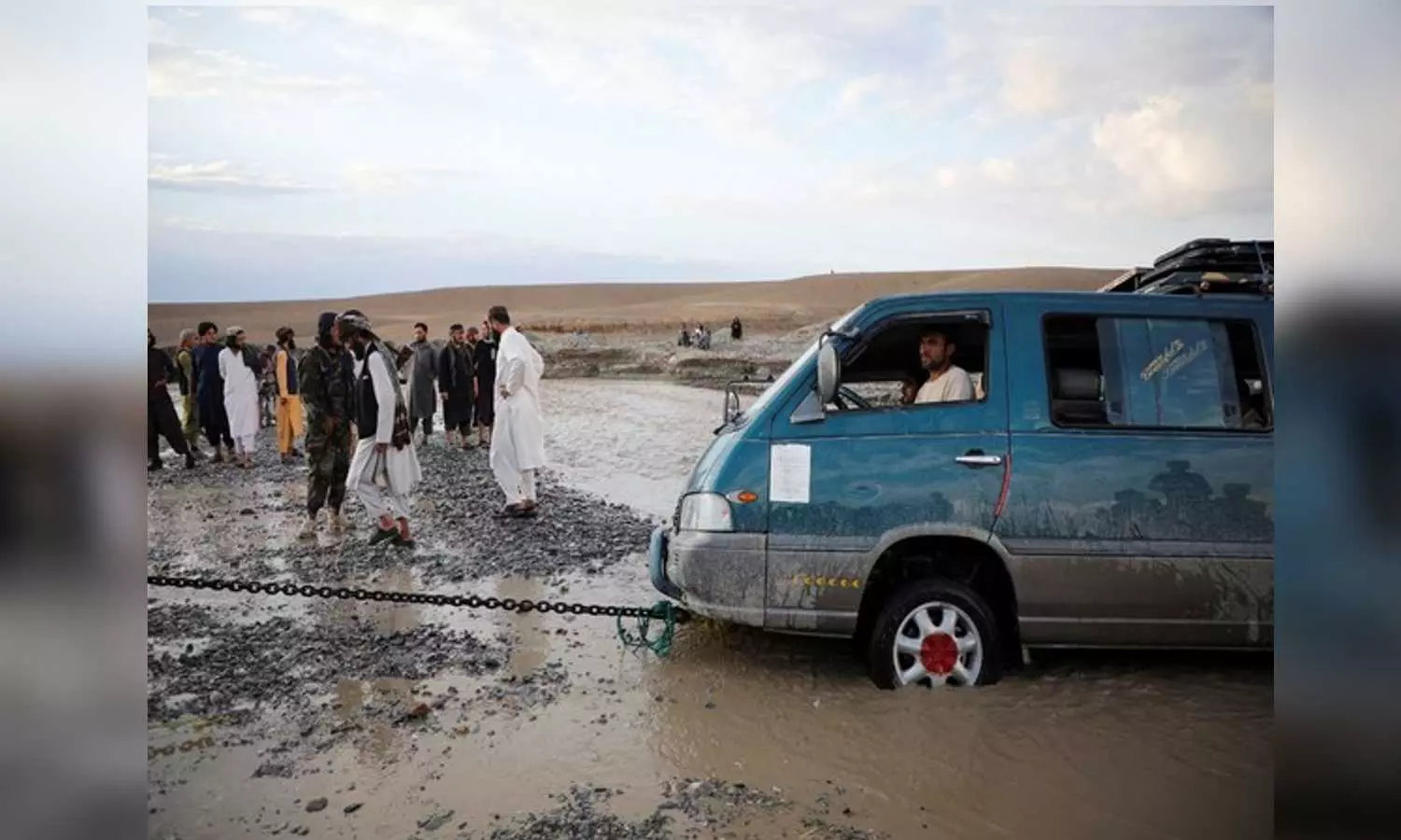 A mini van being towed out of flood water in Afghanistan (Reuters)