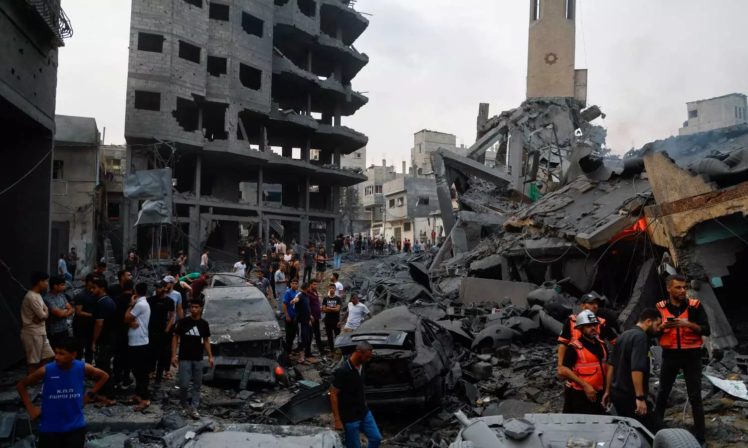 Emergency personnel and Palestinians inspect damages in the aftermath of Israeli strikes. Reuters