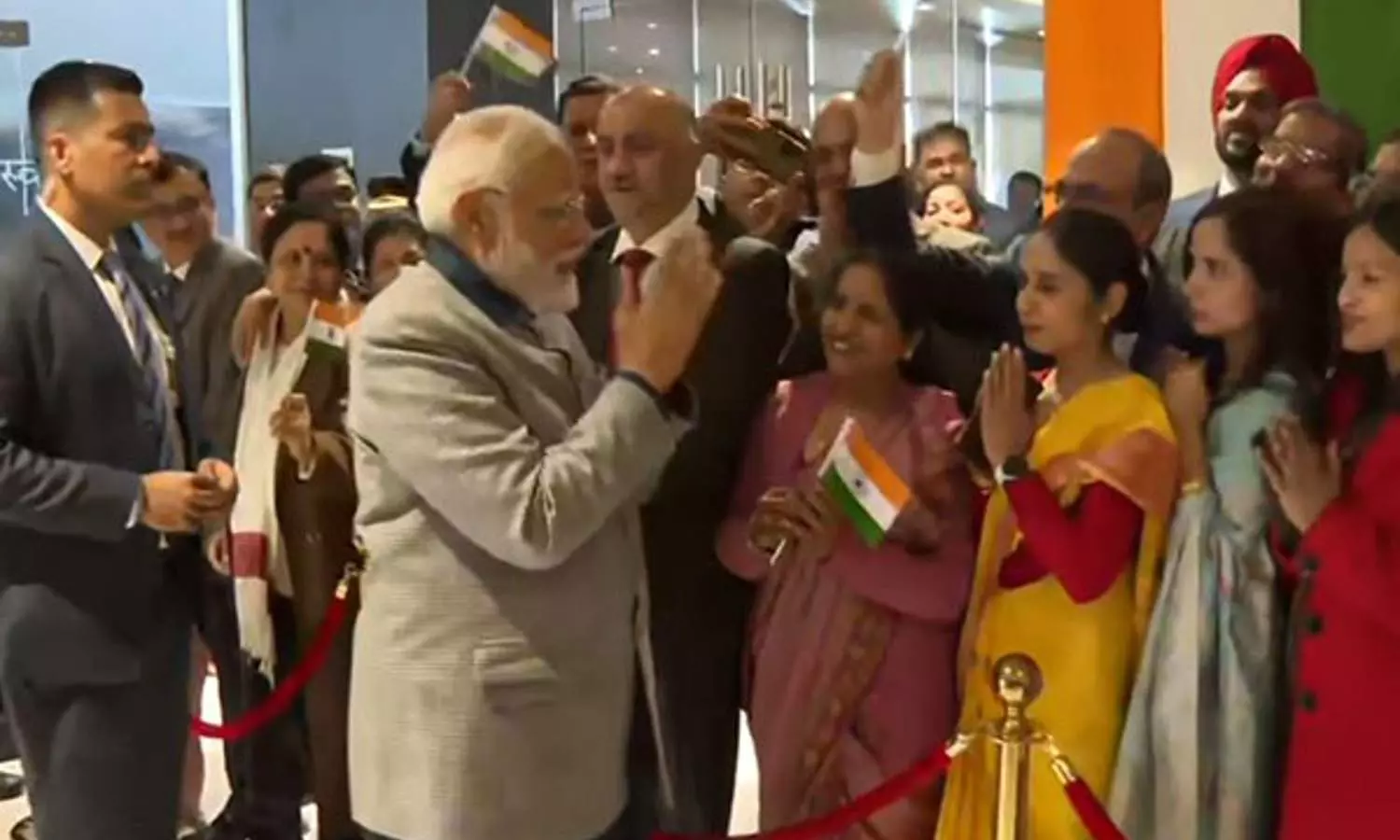 PM Modi was welcomed with a cultural performance at the Hotel and people holding Indian flags to see him.