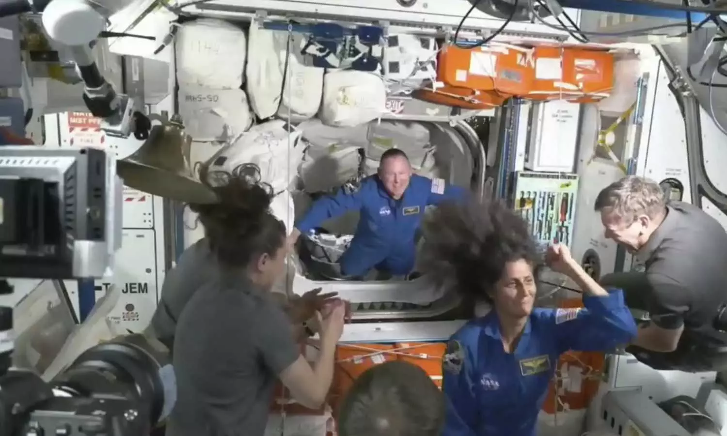 Williams entered the space station first, dancing on the way in to music. Wilmore followed, snapping his fingers. They embraced the seven space station residents.