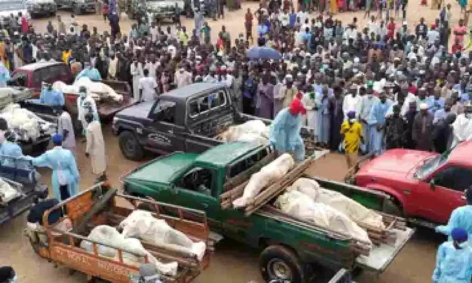 Trucks carry the wrapped bodies of people killed by suspected Boko Haram militants, during their funeral in Yobe, Nigeria (AP)