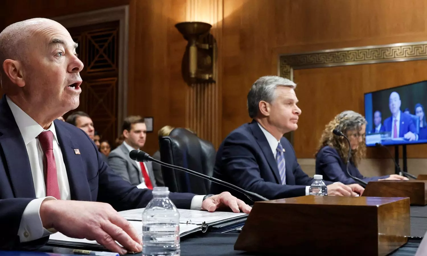 Senator Josh Hawley, a Republican, grilled Mayorkas about why a U.S. asylum officer who reportedly made anti-Israel social media posts had been placed on leave but not fired, saying the employee was "celebrating genocide."