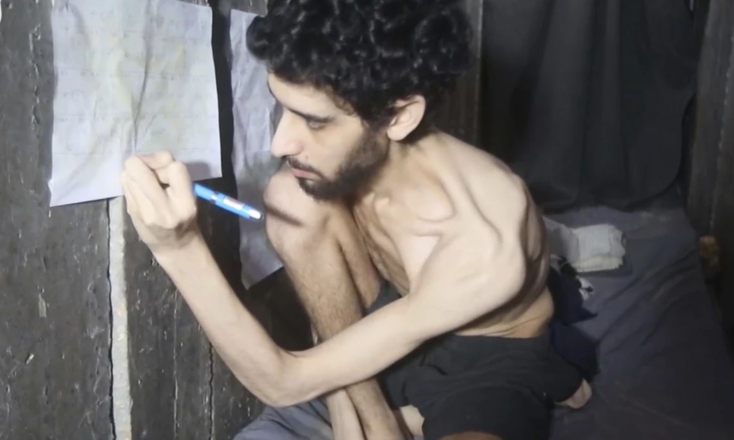 This image from an undated video released on August 1, 2025, by the armed wing of the Palestinian militant group Hamas, shows Israeli hostage Evyatar David marking a food log on a calendar inside the Gaza tunnel where he is being held (AP)