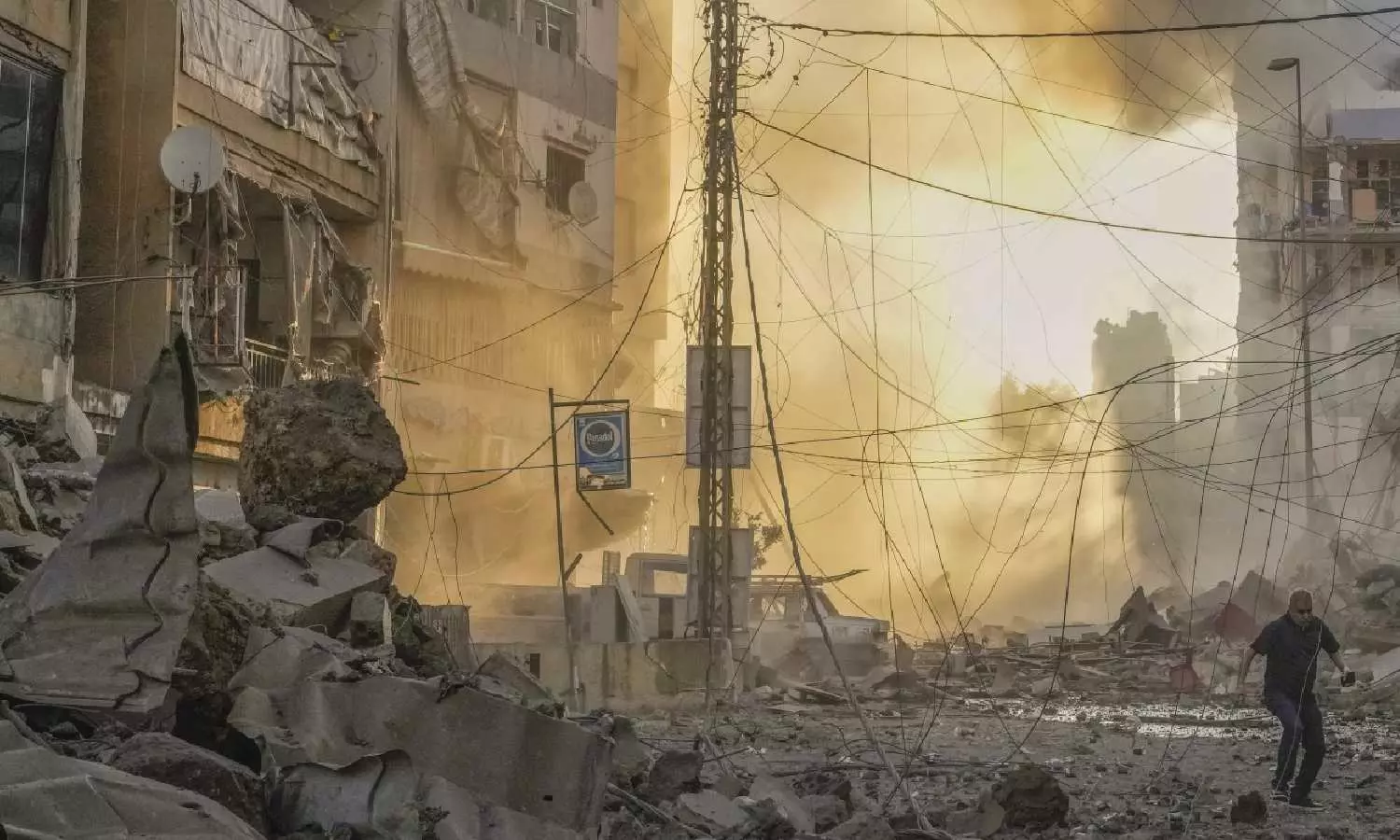 Man runs for cover as a smoke raises in the background following an Israeli airstrike in Dahiyeh, Beirut, Lebanon (AP)
