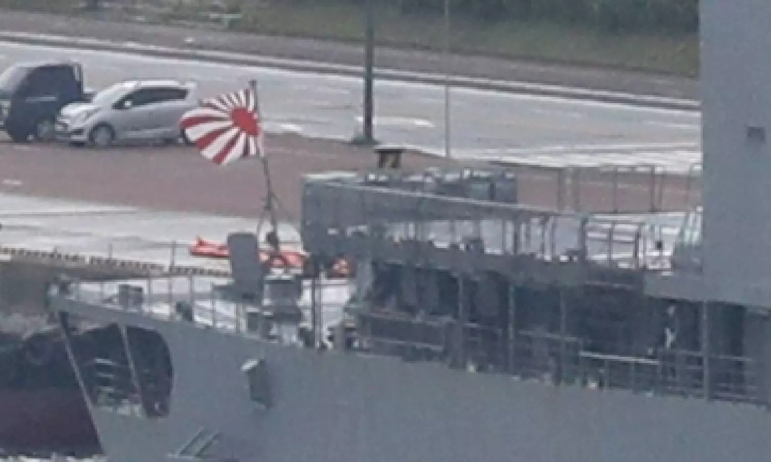 As widely expected, the Japan Maritime Self-Defense Force's warship arrived with the so-called Rising Sun flag hoisted.
