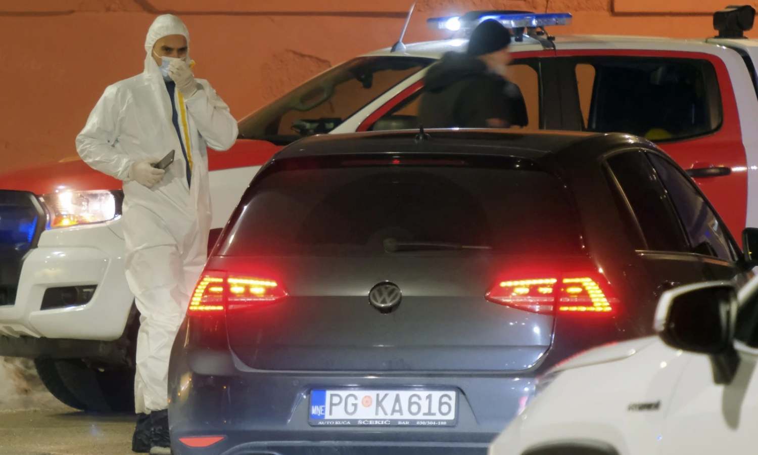 Police investigators work at the site of a shooting in Cetinje, 36 kilometers (22 miles) west of Podogrica, Montenegro (AP)