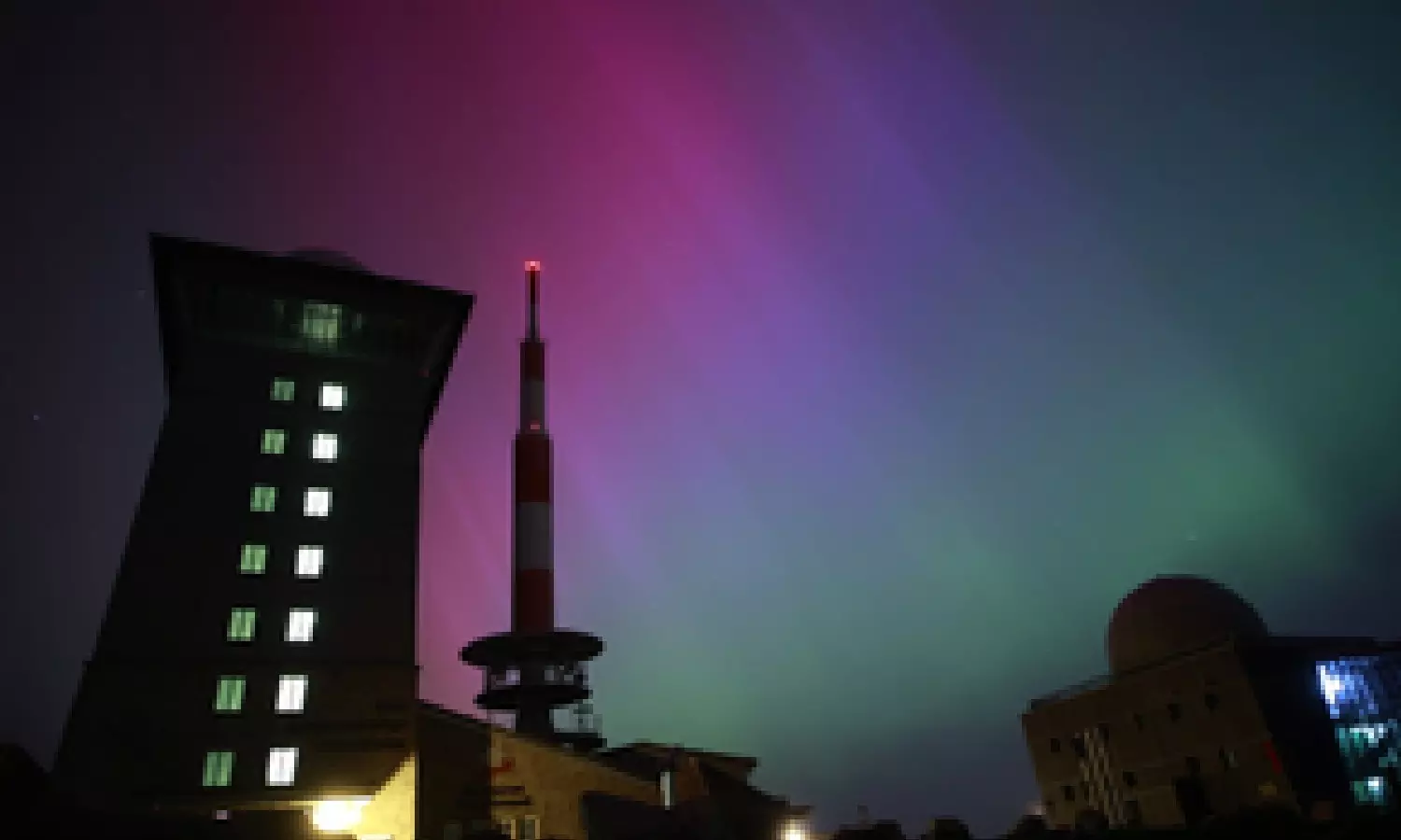 The German Weather Service (DWD) posted an image on X of the Alps in southern Germany lit up in pink, as well as bright rays of light over the Frankfurt skyline. Other images were shared across social media.
