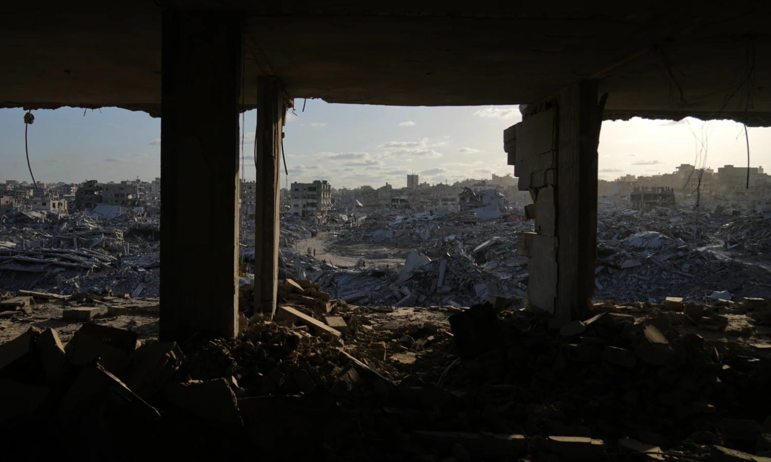 Displaced Palestinians walk amid destroyed buildings in the heavily damaged Sheikh Radwan neighborhood in Gaza City, Saturday, Oct. 11, 2025, after Israel and Hamas agreed to a pause in their war and the release of the remaining hostages. (AP)