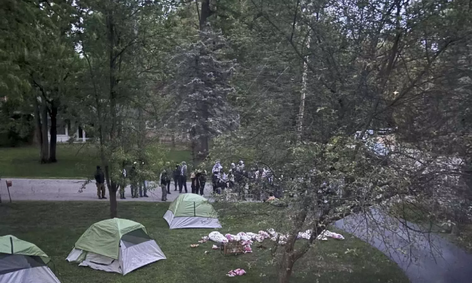 MICHIGAN: Wearing masks, pro-Palestinian protesters pitched tents and placed fake bloody corpses outside the home of a University of Michigan board member IN Okemos, Michigan on Wednesday. This has raised tension with the school.
