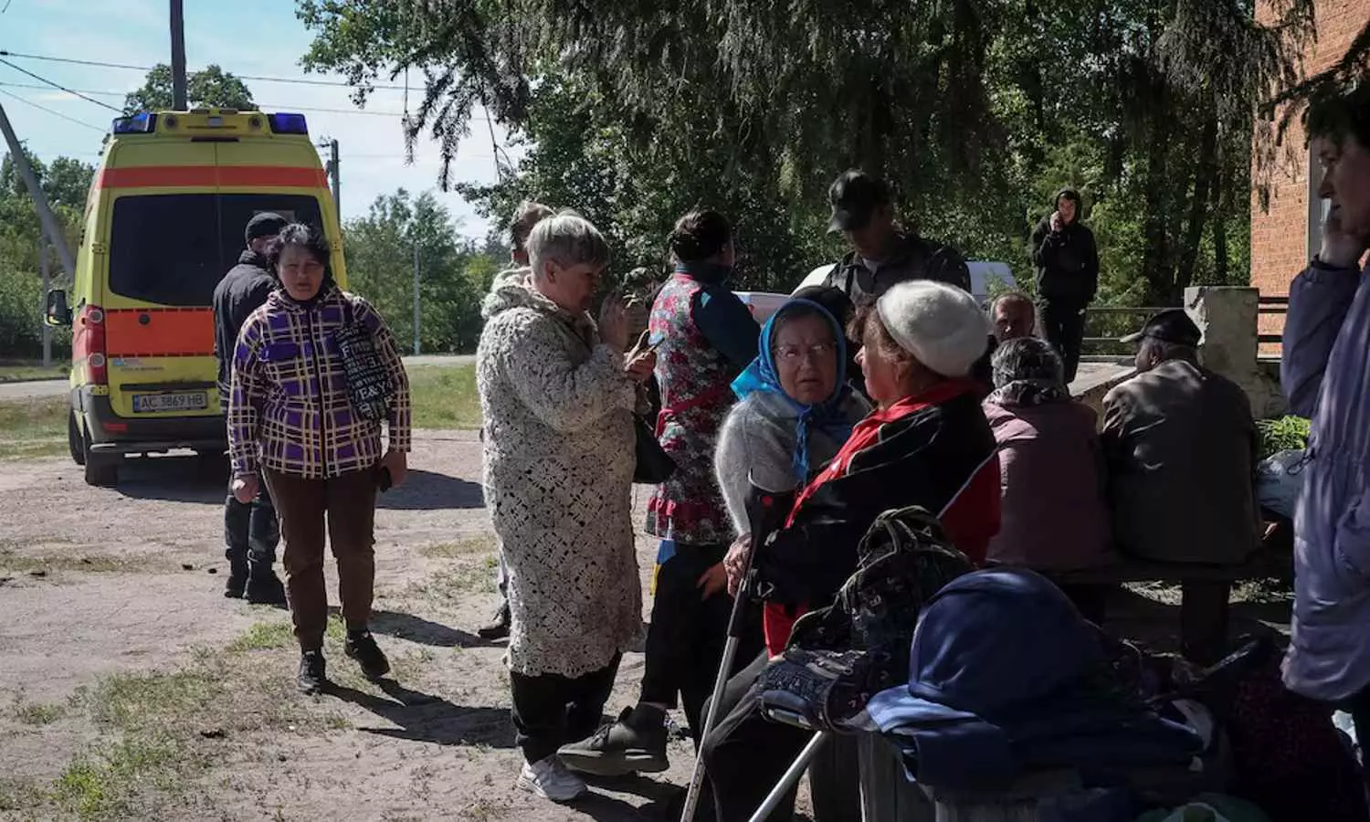 Residents from Vovchansk and nearby villages wait for buses amid an evacuation to Kharkiv due to Russian shelling (Reuters)