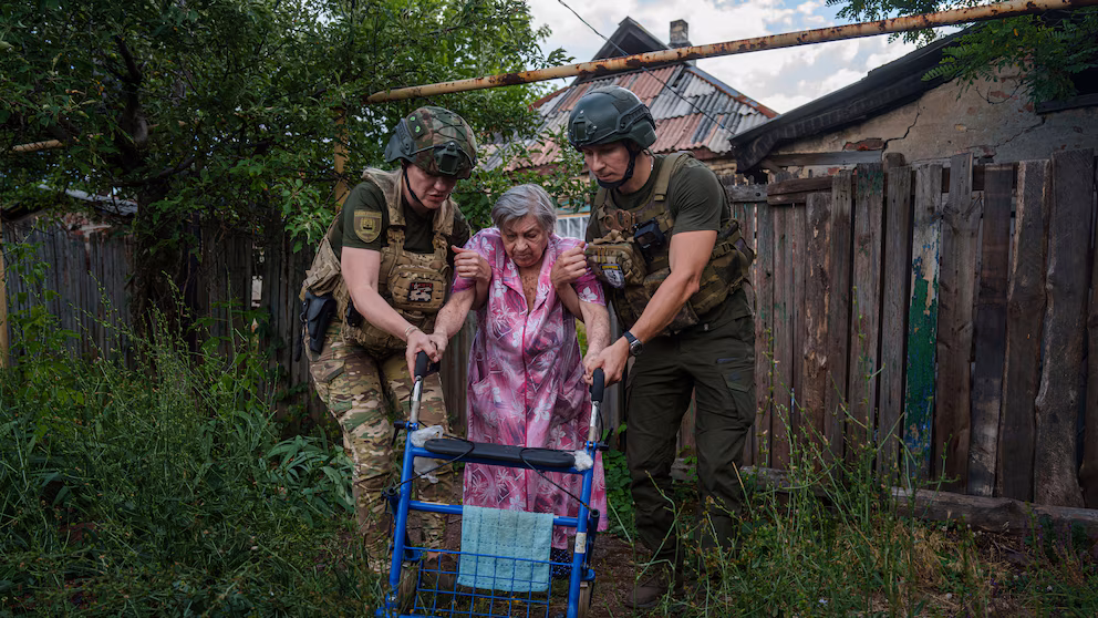 Police officers of the White Angels unit help an elderly woman walk into a van during an evacuation to safe areas (Photo: AP)