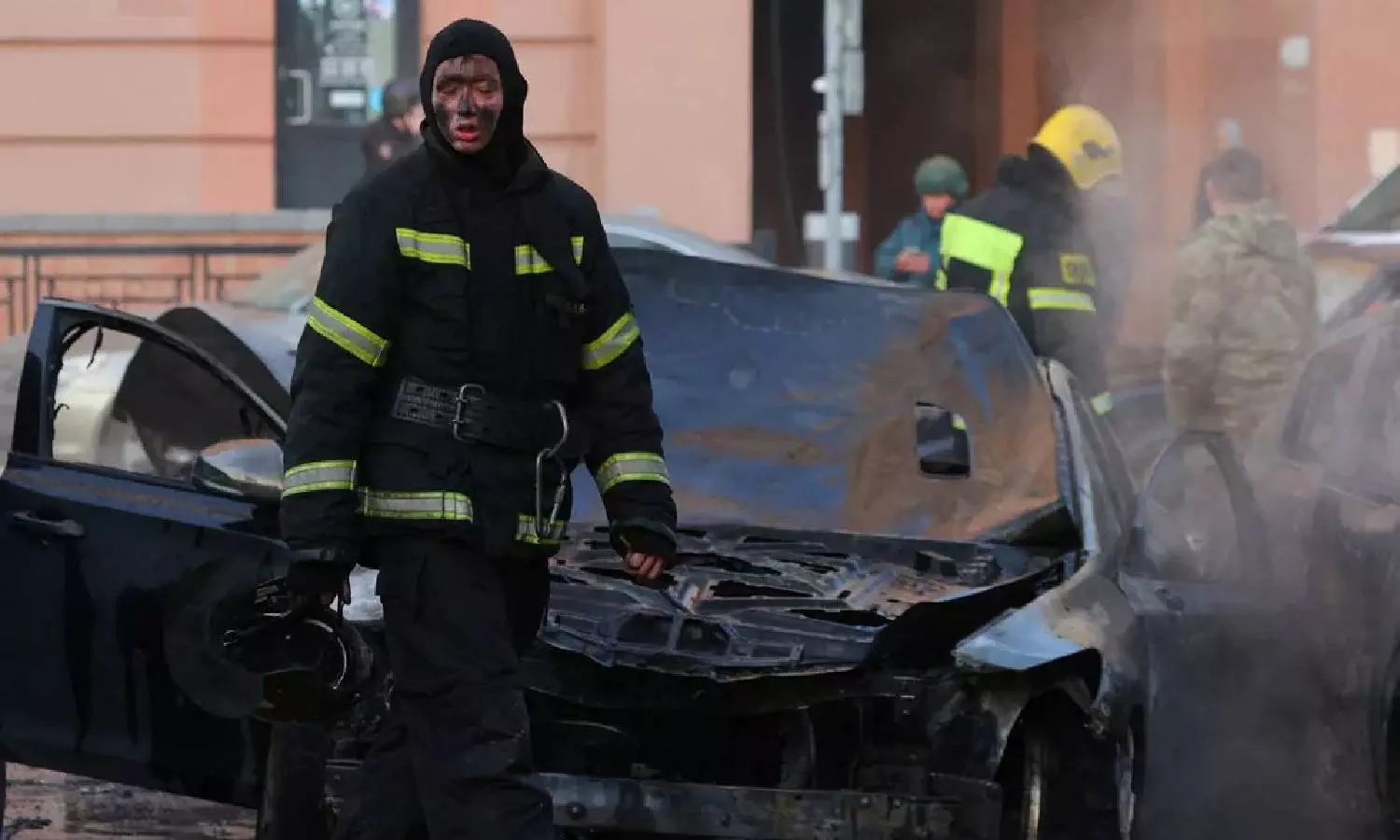 A firefighter takes a pause as he works to extinguish burning cars following what Russian authorities say was a Ukrainian military strike in Belgorod (Reuters)