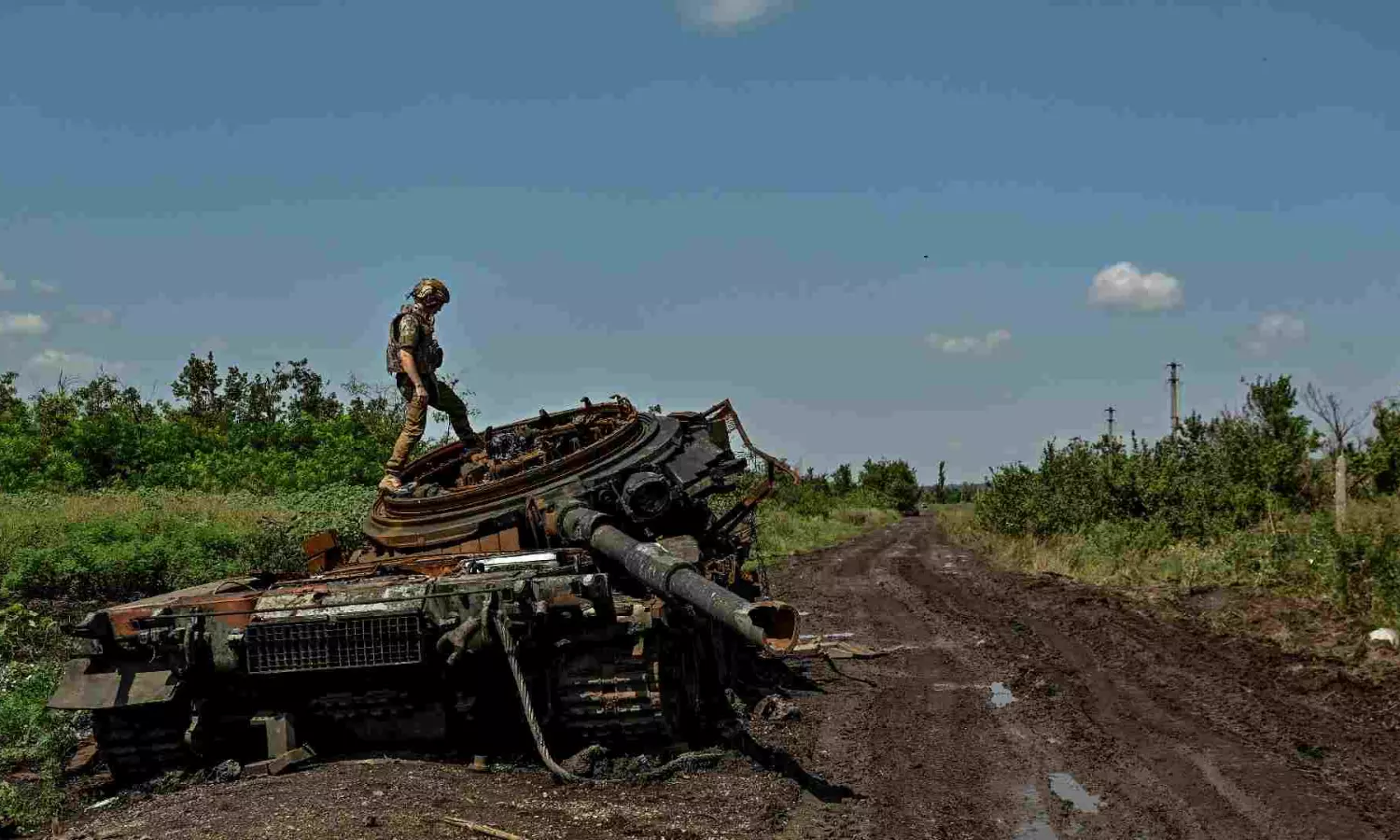 A Ukrainian serviceman inspects a destroyed Russian tank in the recently liberated village of Novodarivka, amid Russia's attack on Ukraine, in Zaporizhzhia region, Ukraine (Photo: Reuters)