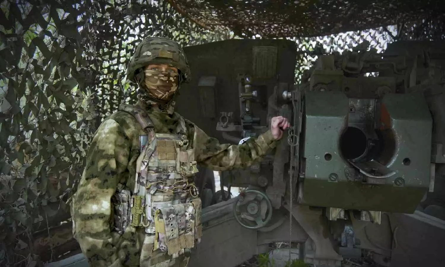 A Russian soldier poses for a photo next to a 2A65 "Msta-B" howitzer at a position in an undisclosed location in Ukraine. (AP)