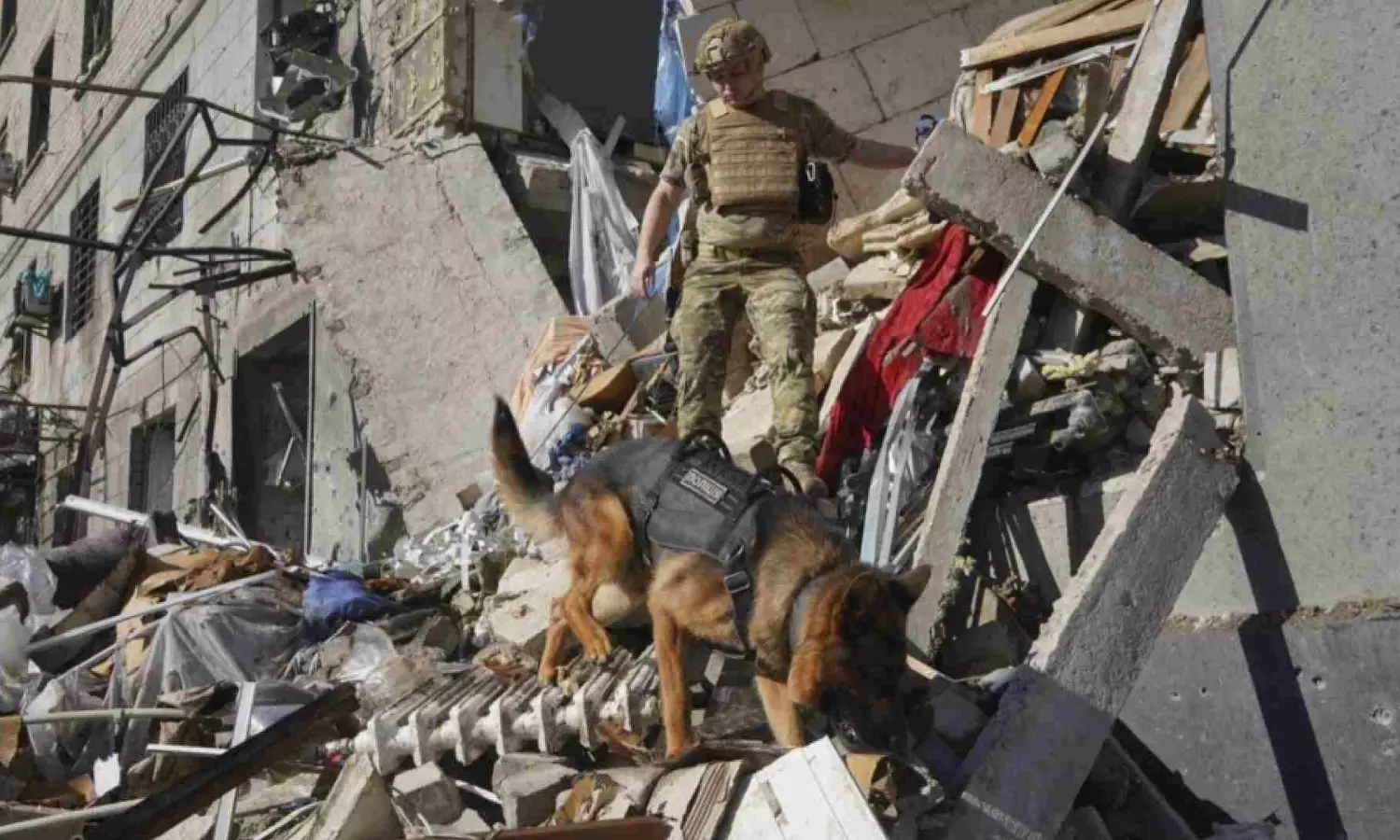 A rescue worker with a dog search for victims in a damaged apartment building after it was hit by Russian air bomb in Kharkiv, Ukraine (Photo/AP)