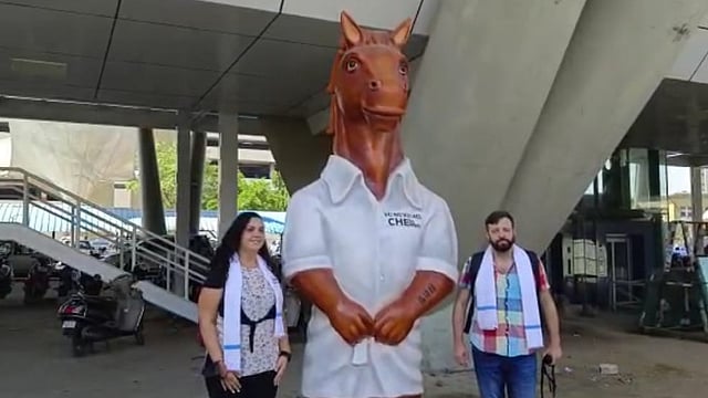 Two players from Hungary, arrived at Chennai International Airport today morning at 8.30 a.m. on an Emirates Airlines passenger flight, from Dubai to Chennai. They were received at the Chennai airport by Tamil Nadu government officials and the welcome team of the Chess Olympics. They were taken to a star hotel in a separate car. Before getting into the car, the players admired the toy statue set up at the airport and took photos.