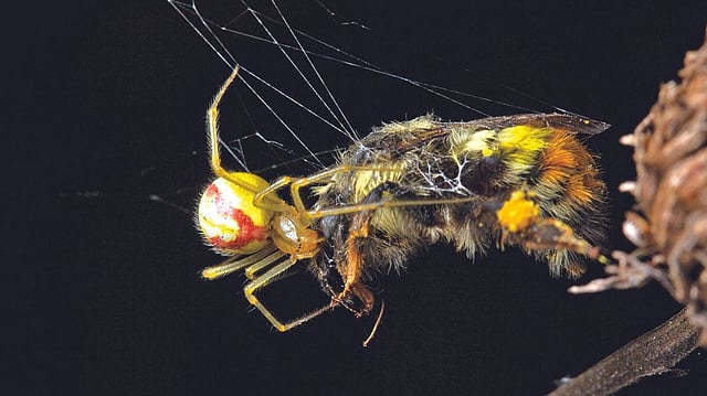 In hospitals, candy stripers are selfless volunteers. Candy-stripers of the eight-legged variety, however, appear not so benevolent. New research reveals that two species of candy-striped spider have secret night lives, leaving their cobwebs to carry out violent predation after dark. Two scientists published their discovery in the journal Ecology. One of them, Catherine Scott, an arachnologist, conducted this research while working on her doctorate at the University of Toronto, Scarborough. She says these common spiders, native to Europe but now widespread in the United States and Canada, are known for doing “fairly normal web-building spider stuff,” and for the genes that cause their stripy features, but their active hunting of big prey at night had escaped notice.
