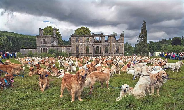 What is the sound of 488 golden retrievers barking? Imagine the sense of helplessness you might feel when someone’s baby is crying and you can’t solve the problem. Then multiply by, oh, 488. Then add in drenching rain and an onslaught of midges. Why the cacophony? Around 4 p.m. on July 13, the dogs had been assembled on the broad lawn in front of the ruins of Guisachan House in the Scottish Highlands to take a group photo of the 2023 Guisachan Gathering, a kind of golden retriever convention, commemorating the anniversary of the founding of the breed. For the photo, the owners were instructed to leash their dog to a stake in the ground and then scurry away for approximately 15 seconds so that the photographer, Lynn Kipps, could capture the wagging horde. Fifteen seconds in golden retriever time is approximately eternity, and 488 golden retrievers evidently believed they had been abandoned forever.