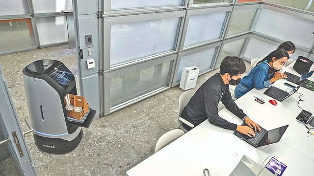 Naver — a soup-to-nuts internet conglomerate in South Korea — has been experimenting with integrating robots into office life for several months. Inside a futuristic, starkly industrial, 36-story high-rise on the outskirts of Seoul, a fleet of about 100 robots cruise around on their own, moving from floor to floor on robot-only elevators and sometimes next to humans, rolling through security gates and entering meeting rooms.