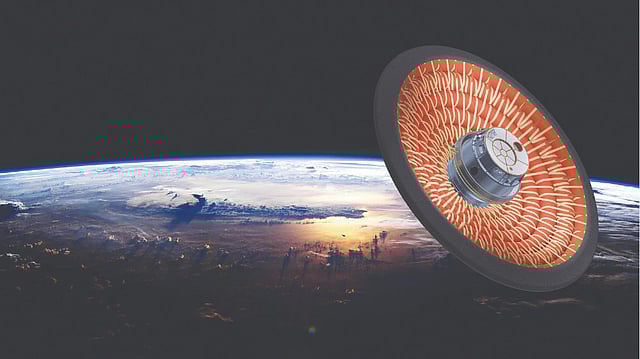 A more accurate description of the device might be that it is a saucer, 20 feet wide when inflated. It is made of layers of fabric that can survive falling into the atmosphere at 18,000 mph and temperatures close to 3,000 degrees Fahrenheit.