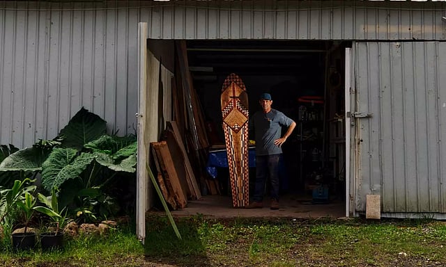 One day this summer, Kinimaka was in his light-filled studio, which is nestled in the verdant Koʻolau Range on Oahu, shaping a piece of wood with a planer that sent wood chips flying. Half a dozen finished boards rested against a wall, their lacquer shimmering in the morning light, but what immediately caught the eye were the intricate patterns embedded in their facades.