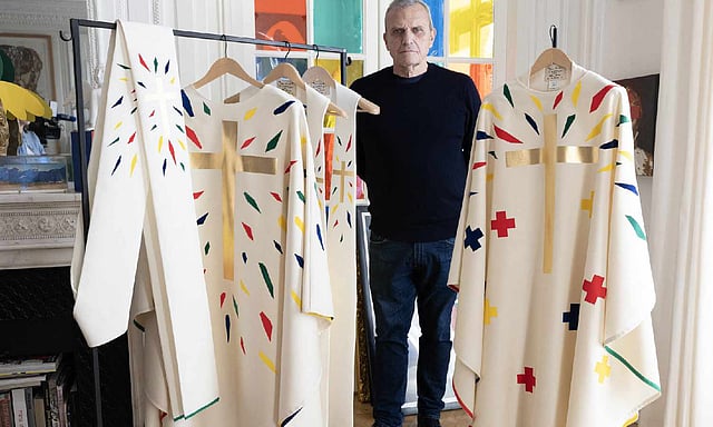 “In the church, lux means light,” de Castelbajac said. “That’s why I proposed to Monsignor Ullrich to design a radiating cross for the liturgical vestments: to express this energy, vibration — rays of light.” Born in Casablanca, Morocco, to an aristocratic French family, de Castelbajac, 74, got his start in fashion in the 1970s, working for Max Mara and Courrèges. In 1978, he introduced his namesake brand and became known for humorous punk- and pop-driven fashion, like the teddy bear coat from 1988, which he said was “a statement against fur.” A variation is now in the permanent collection of the Costume Institute of the Metropolitan Museum of Art; another was recently worn by Drake at a Toronto Raptors basketball game.