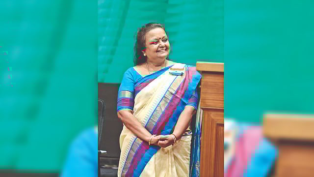 After her inaugural speech, a Class 8 student presented the dancer with a memento. Dakshayani was surprised to see the student wearing the national flag upside down and on the wrong side.