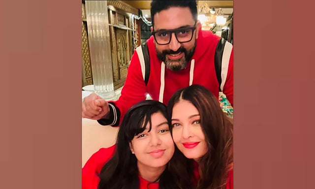 The first image captures the Bachchan family- Aishwarya, Abhishek and their daughter Aaradhya all dressed in shades of red.