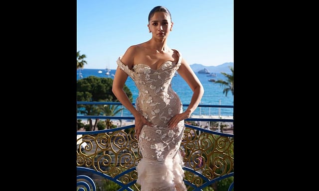 Another picture showed Alia posing elegantly on a balcony with a breath-taking seaside view in the background. She is wearing a form-fitting, off-shoulder gown in champagne hue. The dress has intricate floral embroidery on the bodice and a dramatic, ruffled mermaid-style hem that cascades to the floor.