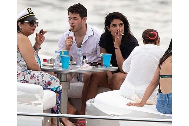 In a photograph doing the rounds on social media, Priyanka is seen smoking a cigarette, while her mother Madhu Chopra and her pop-singer husband Nick Jonas are seen enjoying a cigar on a yacht ride.