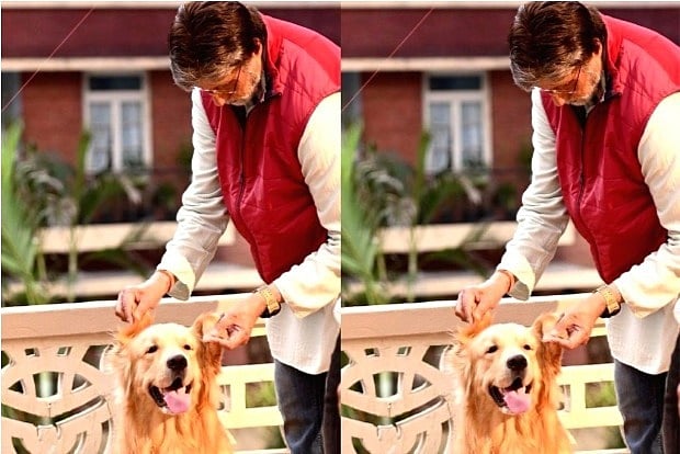 Amitabh Bachchan has shared a picture posing with his "co-star" on his latest post on social media. In the image, the actor is seen playing with a dog, holding its ears!