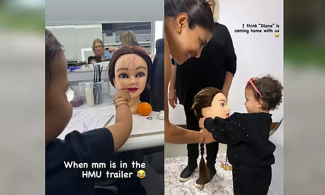 The 1st picture shows her daughter doodling over a mannequin’s face kept on the table. Priyanka wrote on the picture: “When MM is in the HMU trailer.”