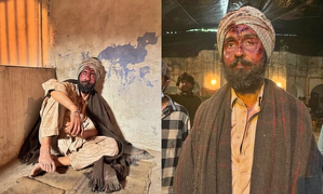 In the first image, Diljit Dosanjh can be seen sitting on the floor in a raw and rugged look, dressed in a simple kurta and turban. His bloodied and bruised face conveys a powerful sense of pain and resilience.