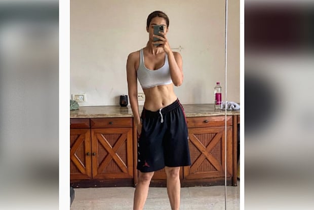 In a new Instagram picture, Disha wears a grey sports bra and black basketball shorts. She is seen taking a mirror selfie.