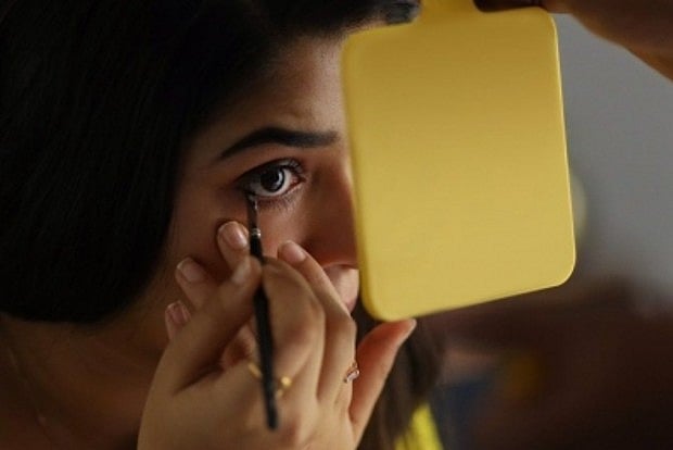 The 'Uppena' actress shared a picture of herself, which appears to be a hint at her role in the upcoming movie. As only her eyes are featured in the poster, Krithi is seen applying kajal.