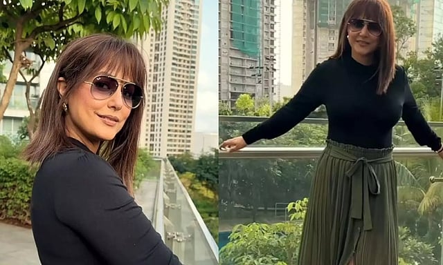 Taking to Instagram, Hina, who has 20.3 million followers, dropped a Reel video, in which we can see her wearing a black long sleeve tee-shirt and paired it with an olive green skirt. She is wearing a hair wig, sunglasses and black heels.