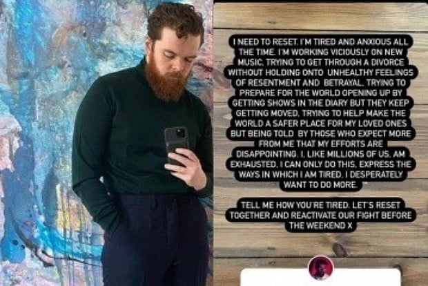 He wrote in the Instagram story: "I need to reset. I'm tired and anxious all the time. I'm trying to work viciously on new music, trying to get through a divorce without holding onto unhealthy feelings of resentment and betrayal."