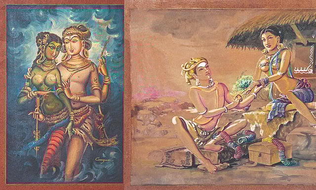 Some of KalaiG an ga’ s well known films include T hi ru va rut ch el var (1967), Thiruvilayadal (1965) and Nenjil Ore Aalayam (1962), where his work created immersive visual worlds. In Veerapandiya Kattabomman (1959), his detailed set design brought to life the era and struggle of the historic figure. “The paintings in this exhibition include themes such as Kovalan and Kannagi from Silapathikaram, and Shiva-Parvati. This is the third edition of an art exhibition hosted by Chithiraalayam,” adds Jayakumar.
