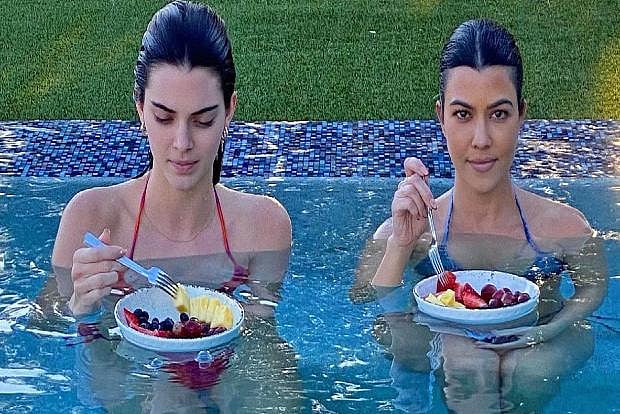 In the image, Kendall and Kourtney sit at the poolside with their backs towards the camera, dressed in bikini. The other picture features the two enjoying a fruit bowl in the pool.