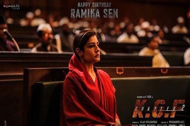 The character poster of 'KGF: Chapter 2,' sees Tandon dressed in a red coloured saree as she is seated in a parliament house. The 'Shool,' actor will be portraying the role of Ramika Sen in the film.